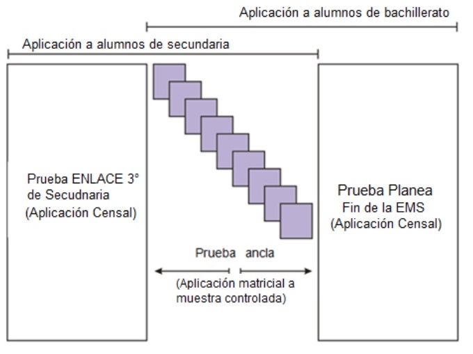 Para realizar el estudio de ganancia educativa, se buscó que las pruebas ENLACE de secundaria y ENLACE/PLANEA MS midieran constructos7 semejantes. Se optó por tomar como medida de ingreso los resultados de ENLACE de tercero de secundaria y para la medida de egreso los correspondientes a ENLACE/PLANEA MS. Con el fin de establecer una escala común entre estos instrumentos, el proceso se apoyó con el diseño de pruebas ancla que primero, como parte de ejercicios previos, y después como instrumento consolidado se aplicaron de forma controlada y se distribuyeron de manera matricial a una muestra representativa de estudiantes, tanto de tercero de secundaria como del último ciclo de bachillerato (Esquema 1).