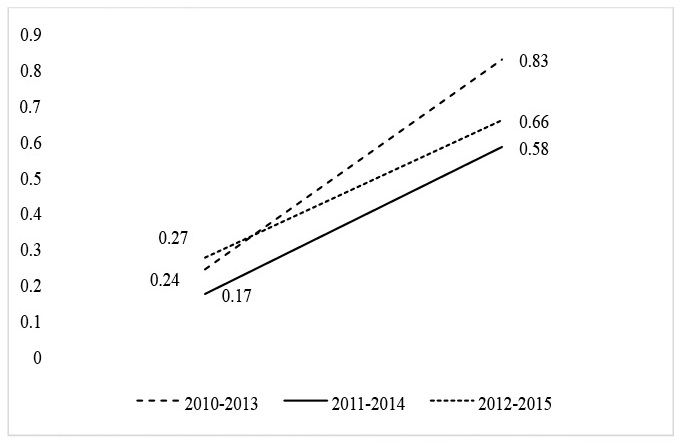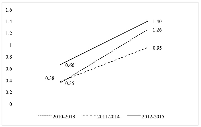 Al comparar gráficamente las medias a nivel nacional, se observa que en el área de Comunicación (Figura 1), los alumnos de las tres generaciones tenían, al momento de ingresar a la educación media superior, un nivel de habilidad similar. Sin embargo, se aprecian diferencias en la distancia entre las medias de habilidad al egresar del tramo educativo, siendo más pronunciada la de la generación 2010-2013. En el área de Matemáticas (Figura 2), los alumnos de las generaciones 2010-2013 y 2011-2014 obtienen una media de habilidad al ingreso muy similar y se separan al egreso, siendo mayor la distancia entre los puntos al final para la generación 2010-2013. Las medias de habilidad de la generación 2012-2015 se encuentra por encima de las otras dos cohortes en ambos momentos de evaluación.