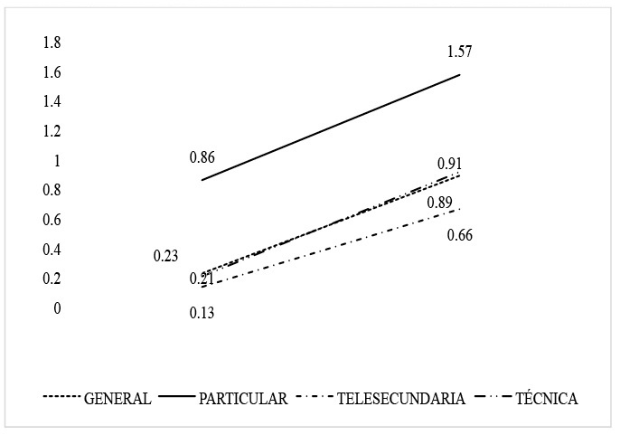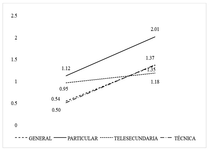 Otro aspecto analizado en este estudio de ganancia educativa es el relativo al tipo de secundaria en la que estudiaron los alumnos. Se consideran cuatro tipos de secundarias: general pública, técnica pública, telesecundaria y secundarias particulares.