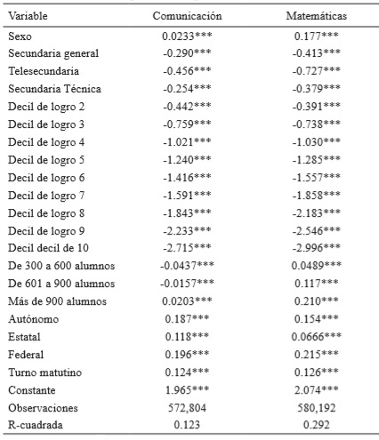 Para medir el efecto de ser hombre o mujer en la variable de interés, se utilizó una variable dicotómica en la cual 1 significa hombre y 0 mujer. Con respecto al tipo de secundaria a la que asistió el alumno, se consideraron cuatro tipos: secundaria general, técnica, telesecundaria y particular. Dichas variables toman el valor de 1 cuando el alumno asistió a los tres primeros tipos de institución y 0 cuando asistió a una secundaria particular, que es la categoría de referencia para los parámetros de esta variable. Los deciles de logro se dicotomizaron para ser incluidos en el análisis. En esta variable, la categoría de referencia es el primer decil en los resultados más bajos en secundaria. Además, se incluyó en el modelo si el alumno asistió o no a un plantel de EMS perteneciente a alguna de las siguientes categorías construidas a partir de la matrícula que atiende: menos de 300 alumnos, entre 301-600 alumnos, entre 601-900 alumnos y más de 900 alumnos. Se tomó la primera categoría como referencia para las otras tres. También se consideró el tipo de sostenimiento del plantel de EMS al que asistió el alumno. Para ello, se construyeron cuatro variables categorías: autónomo, estatal, federal y particular. Los subsistemas considerados en el sostenimiento federal son DGB, DGETA, DGETI, DGECyTM, Colbach ZMCM y CONALEP Oaxaca y Ciudad de México. La categoría de planteles particulares es la de referencia. Finalmente, para estimar el efecto en la ganancia educativa de asistir al turno matutino o vespertino, se construyó una variable dicotómica que asigna el valor de 1 cuando el alumno asiste a la escuela en la mañana y 0 cuando asiste por la tarde.
