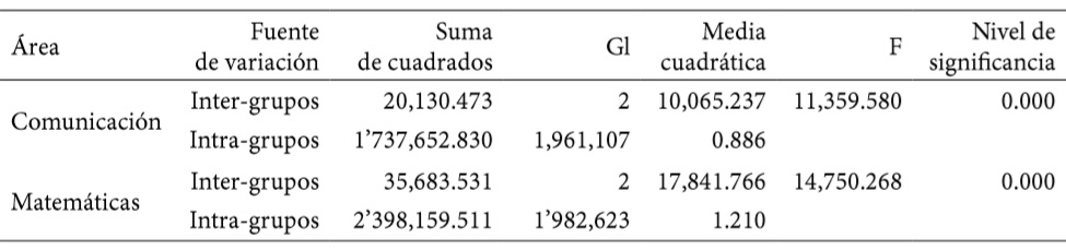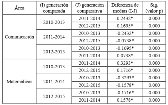 Una vez que se calculó la medida de ganancia, el análisis de varianza (ANOVA) de las medias de ganancia absoluta a nivel nacional permite demostrar que existe una diferencia estadísticamente significativa (p < 0.05) entre las tres generaciones en ambas áreas de la prueba (Tabla 2).