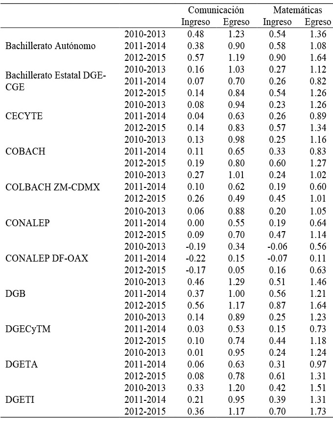 Los resultados de este estudio permiten conocer sí la ganancia educativa de los subsistemas de educación media superior en México se mantuvo a través del tiempo y el paso de las generaciones. A continuación, se presenta esta medida considerando diversas características de los planteles y algunos atributos de los jóvenes que cursan la EMS.