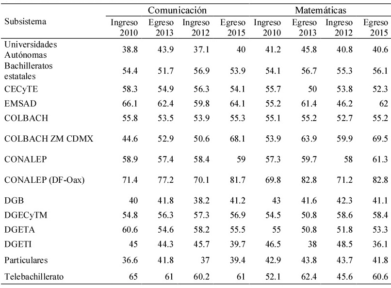 Al comparar las medias de habilidad, se tiene que en el área de Comunicación, los alumnos de las tres generaciones tenían un nivel de habilidad semejante en los diferentes subsistemas al momento de ingresar a la educación media superior. Por supuesto, también se advierten diferencias en los niveles de habilidad al terminar la secundaria de los alumnos que cursaron la EMS en los distintos subsistemas.