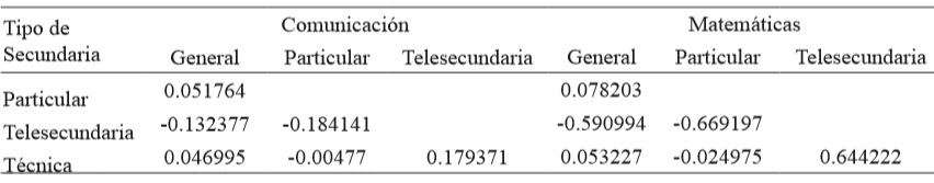 En el área de Comunicación, los alumnos de las secundarias particulares presentan una mayor ganancia educativa, aunque relativamente pequeña; en comparación a los otros tres tipos de secundarias. Entre las secundarias técnicas y las generales, los estudiantes provenientes de las primeras presentan también una ligera mayor ganancia educativa durante sus estudios de EMS. Las menores ganancia se observan en los estudiantes que cursaron la telesecundaria (Figura 5 y Tabla 6).