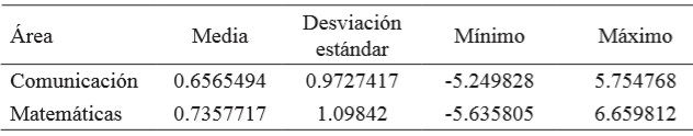 En el análisis, ganancia educativa es la variable dependiente. La estadística descriptiva de la variable se presenta en la Tabla 8, tanto para Comunicación como para Matemáticas.