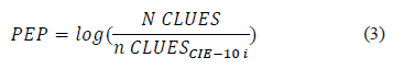 Dos umbrales de interés para el ponderador permiten ejemplificar esta relación inversa: El primero es cuando el padecimiento i (CIE10i) está presente en todos los centros hospitalarios (CLUES), en tal caso el cociente entre las variables N CLUES y n CLUES tomará el valor de 1 y en consecuencia el logaritmo natural y el PEP serán = 0. De forma análoga, la ponderación será mayor a medida que el denominador en la PEP tiende a cero, indicando que la presencia de la enfermedad i en el contexto es más relevante.