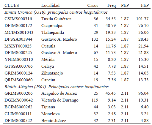 De forma interesante el cálculo para el tipo rinitis crónica revela una importante participación de hospitales en la zona centro del país, específicamente en hospitales ubicados en el Valle de México, en áreas reconocidas por sus serios problemas respecto a la calidad del aire (Cicero-Fernández et al., 2001).