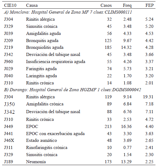 La Tabla 2, apartado A, ilustra el caso de la ciudad de Monclova, tal como se encontró en el análisis previo, esta es una zona de interés para el tema de rinitis alérgica, mientras que el apartado B presenta el caso de la ciudad de Durango, área de interés ya que en esta ciudad se localiza el centro hospitalario de mayor incidencia en todo el país.