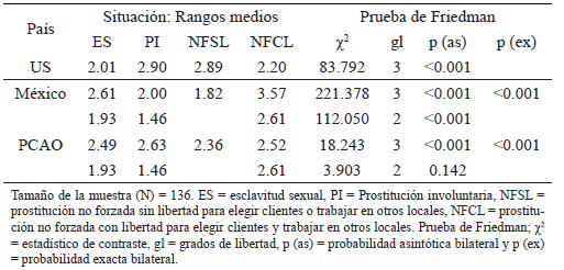 El 35.3 por ciento de las mujeres estuvieron en la situación de esclavitud sexual en México, 7.4 por ciento en EEUU, y 6.6 por ciento en su PCAO. La diferencia de tendencia central fue estadísticamente significativa entre los tres países (prueba de Friedman: χ2[2, N = 136]) = 44.071, p < 0.001) con un tamaño del efecto pequeño (W = 0.162).