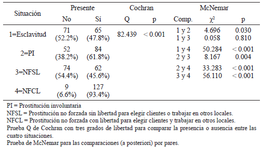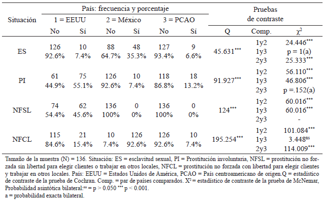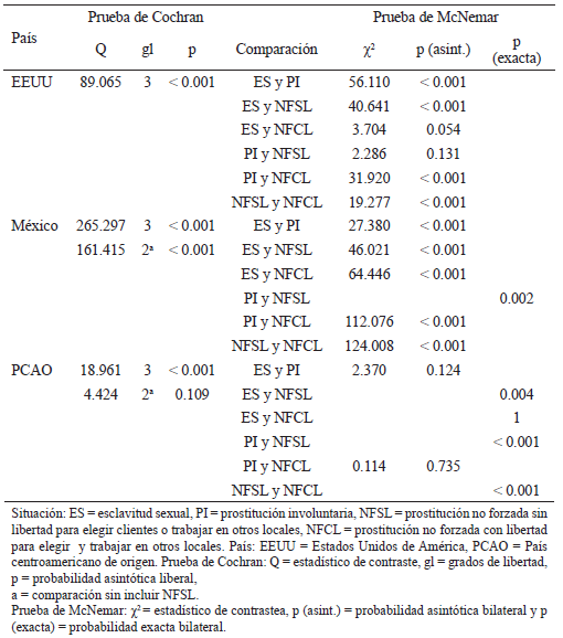 Al comparar la presencia o ausencia de las cuatro situaciones en cada país en el que se ha ejercido la prostitución por la prueba de Cochran y las comparaciones por pares por la prueba de McNemar, el resultado de diferencias significativas fue el mismo que el obtenido con las pruebas de Friedman y Wilcoxon, salvo la comparación entre la presencia o ausencia de esclavitud sexual y prostitución no forzada con libertad para elegir clientes y trabajar en otros locales en EEUU que no fue significativa (prueba de McNemar: χ2[1, N =136] = 3.704, p = 0.054) (véase la Tabla 10).