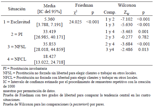 Al comparar el promedio de meses en las cuatro situaciones en EEUU, hubo diferencia de tendencia central (prueba de Friedman: χ2[3, N = 136] = 83.792, p < 0.001) con un tamaño de efecto pequeño (W = 0.205). El promedio de meses más alto fue en la situación de prostitución involuntaria, estadísticamente equivalente al de prostitución no forzada sin libertad para elegir clientes o trabajar en otros locales (prueba de Wilcoxon: Z = -1.398, p = 0.162), y significativamente mayor que el promedio de meses en la prostitución no forzada con libertad para elegir clientes y trabajar en otros locales (prueba de Wilcoxon: Z = -3.717, p < 0.001; r = 0.319) y esclavitud sexual (prueba de Wilcoxon: Z = -6.961, p <0.001; r = 0.597).