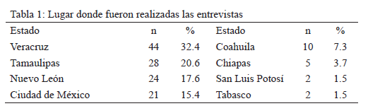 Debido al carácter oculto de la población objeto de estudio, el único acercamiento posible fue a través del uso de un muestreo no probabilístico, de modo que se empleó el muestreo intencional. Se recolectó una muestra de mujeres migrantes de Centroamérica que habían emigrado a Estados Unidos una o más veces, habían sido deportadas, y tenían experiencia de haber emigrado a México dos o más veces. Ellas se encontraban en México, en situación de tránsito hacia Estados Unidos. Deseaban salir de México para llegar a Estados Unidos; pero algunas carecían de recursos económicos para pagar las tarifas cobradas por los polleros, mientras que otras estaban esperando a un pollero recomendado por un familiar, amigo, paisano o patrón, o todavía no habían encontrado a ninguno confiable. El procedimiento utilizado para seleccionar la muestra fue el muestreo en cadena. Las entrevistas fueron realizadas en diferentes localidades de ocho estados mexicanos (Chiapas, Veracruz, Ciudad de México, San Luis Potosí, Tamaulipas, Nuevo León, Coahuila y Tabasco) durante los años de 2013 al 2016 (véase Tabla 1).