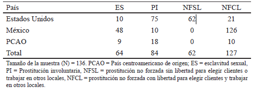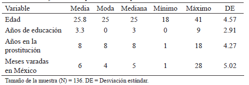 La muestra quedó integrada por 136 participantes. 73 eran de Guatemala, 28 de El Salvador, 25 de Honduras, 7 de Nicaragua, 2 de Belice y 1 de Colombia.2 Todas las entrevistadas eran mayores de edad, y sus edades se extendían en un rango de 18 a 41 años de edad; su nivel de escolaridad era bajo, en promedio sumaba 3.3 años, y el número de años en la prostitución se extendía desde 1 a 18. Por otra parte, las entrevistadas habían quedado varadas en México durante un promedio de 6 meses (véase Tabla 2).