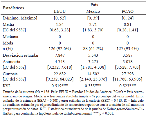 La diferencia de tendencia central fue estadísticamente significativa entre los tres países (prueba de Friedman: χ2[2, N = 136]) = 90.609, p < 0.001) con un tamaño de efecto mediano (W = 0.333). Al hacer las comparaciones a posteriori, la tendencia central en EEUU fue significativamente mayor que en México (prueba de Wilcoxon: Z = -6.789, p < 0.001) y en el PCAO (prueba de Wilcoxon: Z = -6.476, p < 0.001), siendo el tamaño del efecto grande en ambos casos (│r│= 0.582 y 0.555, respectivamente).