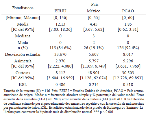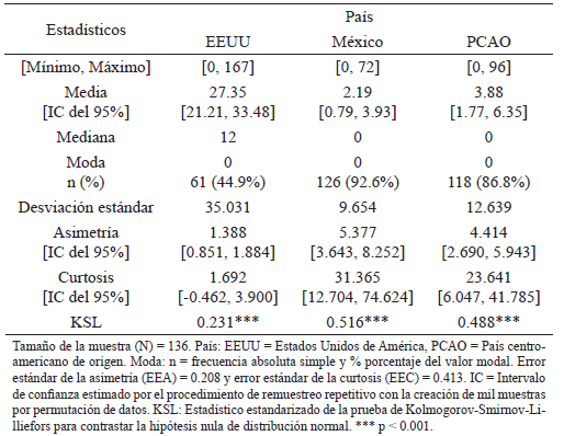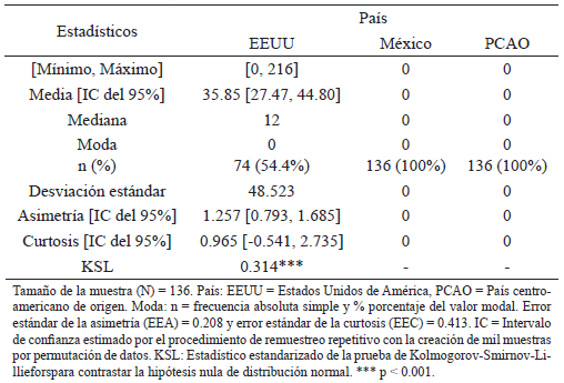 Las distribuciones de las 12 variables de meses en las cuatro situaciones de prostitución (esclavitud sexual, prostitución involuntaria, prostitución no forzada sin libertad para elegir clientes o trabajar en otros locales y prostitución no forzada con libertad para elegir clientes y trabajar en otros locales) en los diferentes países (Estados Unidos (EEUU), México y país centroamericano de origen (PCAO)) mostraron una marcada asimetría y curtosis, no ajustándose a una curva normal por la prueba de Kolmogorov-Smirnov-Lilliefors con un nivel de significación unilateral de 0.05. En las 12 variables el valor modal fue 0, salvo en la situación de prostitución no forzada con libertad para elegir clientes y trabajar en otros locales en México que fue tres meses. También la mediana (Mdn) fue 0, salvo en las situaciones de explotación sexual y prostitución no forzada sin libertad para elegir clientes o trabajar en otros locales en EEUU (Mdn = 12 meses en ambas variables), así como en la situación de prostitución no forzada con libertad para elegir clientes y trabajar en otros locales en México (Mdn = 3 meses).