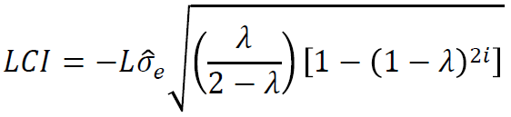 El valor de λ para el estadístico EWMA es importante, Montgomery (2009) recomienda valores de 0.05 ≤ λ ≤ 0.25. Urbieta et al. (2017) realizan un análisis comparativo para diversos valores de λ para un gráfico de control EWMA para residuos de desviación de una regresión binomial negativa, siendo los valores de λ más pequeños los que presentan mejor rendimiento. Por tanto, se escogió de valor de λ = 0.05. El valor de L = 1.36 fue obtenido mediante simulación de un gráfico EWMA para una variable normalmente distribuida con media 0 y desviación estándar estimada de 1. Por consiguiente, los límites de control para los gráficos serían: