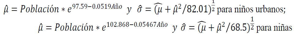 Las estimaciones de los coeficientes del modelo log(Deaths) = β0 + βiYear + log (Population) + ε para el caso de niños y niñas se presentan en las columnas “Estimación” de las tablas 1 y 2. Los coeficientes que corresponden a ambos modelos indican que, a medida que pasa el tiempo la media de muertes en los niños y niñas del área urbana se reduce en cinco por ciento con respecto al año anterior.