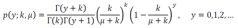 El modelo de regresión Binomial Negativa es un GLM que combina las distribuciones Gamma y Poisson (Agresti, 2002). Supongamos que . tiene una distribución Poisson con media λ, y a su vez λ tiene una distribución Gamma G(k, μ), entonces λ tiene una densidad dada por:
