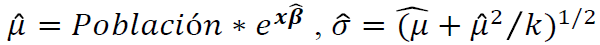 Población representa el tamaño de la población del cual se desea estimar el número medio de muertes, βest es el vector de estimadores de máxima verosimilitud de los coeficientes del modelo y x representa a las variables usadas en el modelo de regresión binomial negativa.