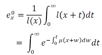 es la esperanza de vida a la edad x, l(x) es el número de sobrevivientes a la edad x, t es el tiempo y es la tasa instantánea de mor- talidad.