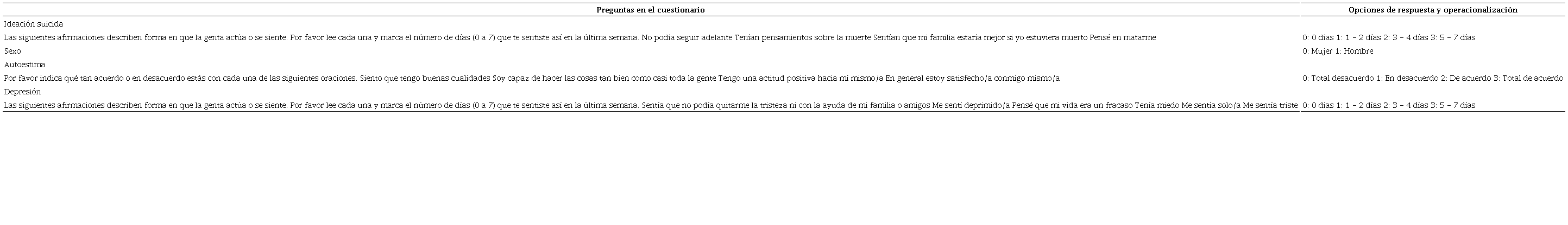 Se incorporaron como factores explicativos aquellos que en la revisión de la literatura se consideran como los más relevantes para explicar la ideación suicida entre los jóvenes y adolescentes. En la Tabla 1 se pueden observar tanto la pregunta del cuestionario como las opciones de respuesta. Las opciones de respuesta no se modificaron del cuestionario, pero se les asignó un valor de 0 a 3 en el caso de la ideación suicida, la autoestima y la depresión y de 0 o 1 en la variable de sexo del ESB (Tabla 1). A continuación se mencionan algunas características de los factores explicativos.
