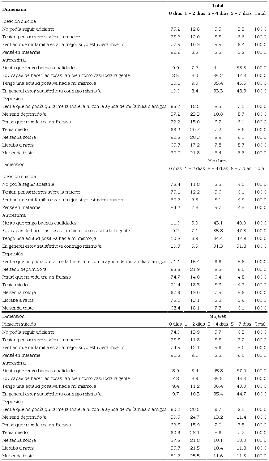La distribución según el sexo de los ESB es similar, pero destaca que entre las mujeres estudiantes el síntoma de ideación suicida que reportaron con mayor frecuencia fue que “No podía seguir adelante” (con 26 por ciento) por lo menos un día a la semana; mientras que entre sus pares del sexo masculino fue “Tenían pensamientos sobre la muerte” con 23.9 por ciento (Tabla 2).