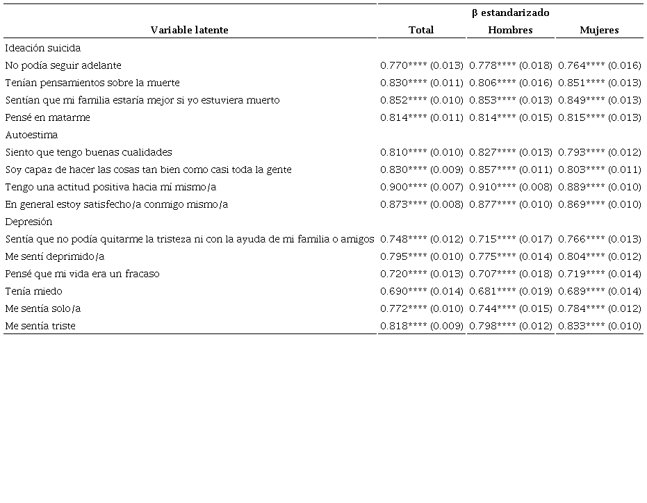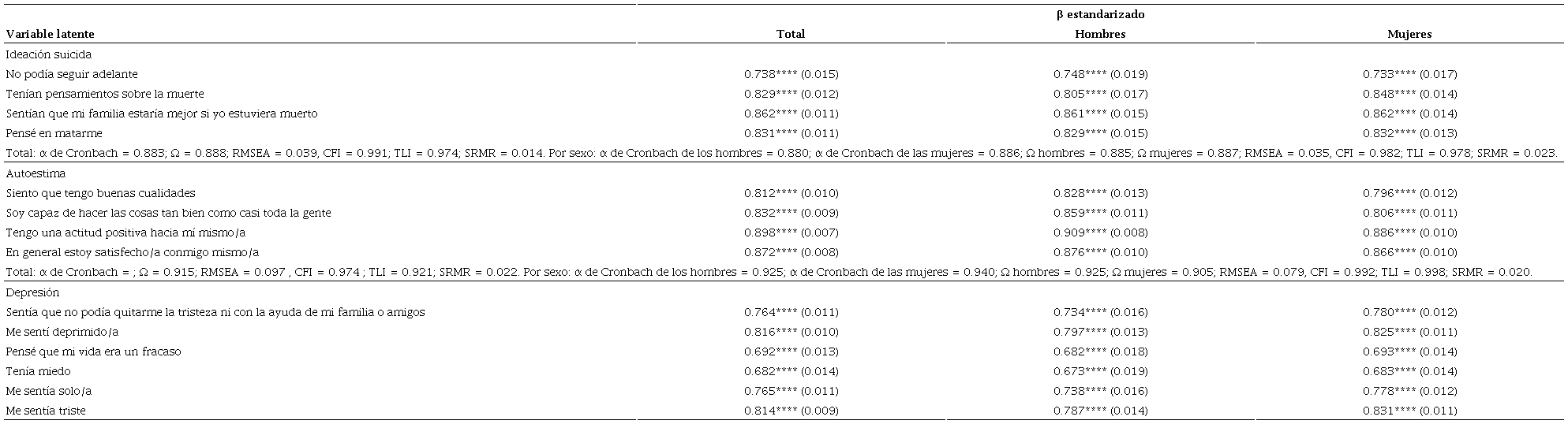 Los resultados de los AFC para los tres constructos latentes (ideación suicida, depresión y autoestima) muestran que tuvieron una buena consistencia interna tanto para el total de los ESB como por sexo, ya que tanto el alfa de Cronbach, como el indicador Ω tienen valores superiores a 0.80. Además, los cuatros parámetros de bondad de ajuste de los tres constructos latentes se encuentran en los límites aceptables (Tabla 3). En el constructo latente de ideación suicida, tanto para el total de los ESB como por sexo, la variable observada que más contribuyó fue “Sentían que mi familia estaría mejor si yo estuviera muerto”. Por su parte, en la variable latente de autoestima, en todos los casos, la característica con una mayor contribución estadística fue “Tengo una actitud positiva hacia mí mismo/a”.