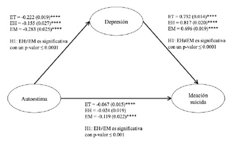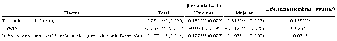 Por otro lado, el efecto indirecto de la autoestima sobre la ideación suicida mediado por la depresión resultó ser negativo y estadísticamente significativo para el total de los ESB y por sexo. El efecto total de la autoestima sobre la ideación suicida (que corresponde al efecto directo más el efecto indirecto) fue más del doble para las mujeres que para los hombres ESB. De esta manera, se puede observar que los resultados del modelo de SEM muestran que la depresión tuvo un efecto potenciador en la ideación suicida ante niveles más bajos de autoestima. Dicho efecto fue mayor entre los hombres, de tal manera que para ellos, aun cuando la baja autoestima no tiene un efecto directo sobre la ideación suicida, la autoestima sí tiene un efecto ante la presencia de sintomatología depresiva (Tabla 5).