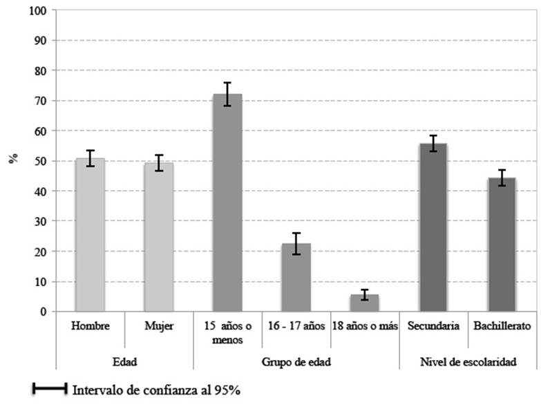 La distribución por sexo de la población analizada de ESB fue muy similar, de cada 100 EBS en la CDMX, 51 eran hombres y el resto mujeres. Los estudiantes en su mayoría tenían 17 años o menos y estaban divididos de manera similar entre los niveles de secundaria y bachillerato (Figura 1).