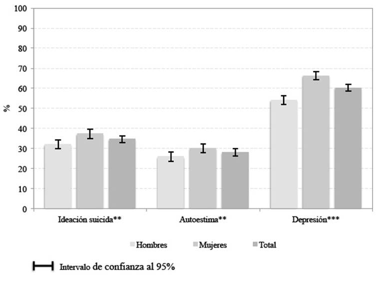 Se observó que poco más de una tercera parte de los ESB presentaron por lo menos un síntoma de ideación suicida al menos una vez a la semana, con una mayor frecuencia femenina (Wolfe et al., 2019). Un estudio realizado en la Región Metropolitana de Santiago de Chile encontró una prevalencia de ideación suicida en adolescentes casi 60 por ciento (Ventura-Juncá et al., 2010), mientras que en Canadá encontraron una prevalencia de 33 por ciento (Brezo et al., 2007) y en Estados Unidos de 24 por ciento (Waldrop et al., 2007). En una revisión sistemática se concluyó que 29.9 por ciento de adolescentes ha tenido ideas suicidas en algún momento de su vida (Evans et al., 2005); mientras que en adolescentes del Área Metropolitana de la CDMX en 2013 se obtuvo una prevalencia de ideación suicida de 15.9 por ciento (Borges et al., 2017). Además, según la OMS de 12 a 25 por ciento de los adolescentes presentan alguna idea frente al suicidio (Ceballos-Ospino et al., 2015). Como se observa, la prevalencia de ideación suicida en adolescentes oscila entre 11.5 y 60 por ciento. Cabe señalar que dichas prevalencias y la aquí presentada no son comparables por la forma en cómo se estimó el constructo latente de ideación suicida. De igual forma, casi dos terceras partes de los adolescentes ESB de la CDM tuvieron al menos un síntoma depresivo; y al igual que la ideación, esta prevalencia fue mayor para las mujeres. Este resultado es similar al encontrado en otro estudio en el cual las mujeres adolescentes presentaron una mayor prevalencia de depresión (Breslau et al., 2017). En cuanto a la autoestima se observó que los hombres tuvieron una mayor autoestima entre los ESB. Esto mismo se ha observado en otras investigaciones y otros contextos (Birndorf et al., 2005; Sánchez-Queija et al., 2017).