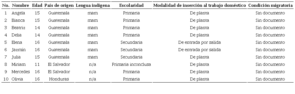 Se entrevistó a un total de diez niñas y adolescentes; siete procedentes de Guatemala, dos originarias de El Salvador y una procedente de Honduras en un rango de 11 a 16 años de edad. Todas ellas trabajadoras del hogar, ocho de ellas en modalidad de trabajadora de planta y dos en modalidad de trabajadora de entrada por salida. Cabe señalar que la niña de menor edad (11 años) procedía de El Salvador. No fue posible entrevistar niños y adolescentes varones a pesar de que durante el trabajo de campo salió a la luz la presencia de estos en el trabajo del hogar. Las siete niñas y adolescentes de Guatemala eran hablantes de lengua indígena mam. Cuatro de ellas terminaron únicamente la escolaridad primaria y tres estaban en alguna etapa de la escolaridad básica (escolaridad secundaria), ellas afirmaron que estaba trabajando para poder ahorrar y así hacer frente a los costos de la educación diversificada (bachillerato).