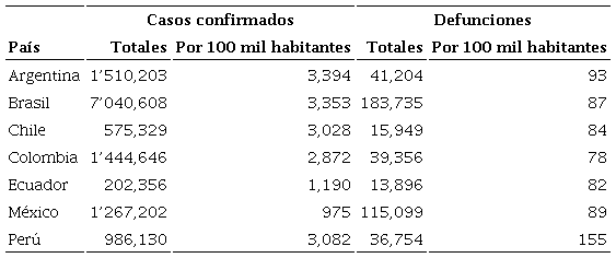 Como se puede observar en la Tabla 1 y a la fecha de corte, en Latinoamérica, el país con mayor número de casos confirmados por cada 100 mil habitantes era Argentina con 3,394, el segundo país más afectado es Perú con poco más de tres mil casos por cada 100 mil personas, mientras que en el caso de México había cerca de mil casos confirmados por cada 100 mil individuos. En las defunciones, el comportamiento es similar a lo observado para los casos confirmados para estos países. Por ejemplo, en México había 89 defunciones por cada 100 mil habitantes, aunque Perú mostraba una cifra superior al ser de 115 muertes.