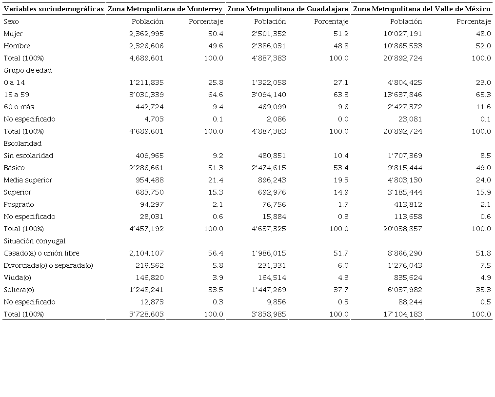 Como se comentó, las tres zonas metropolitanas que se estudian se caracterizan por ser las más pobladas del país, por lo que resulta interesante conocer la estructura poblacional de estas urbes. En particular se analizan las variables socidoemográficas como el sexo, la edad (grupos etarios), la escolaridad y la situación conyugal a las poblaciones estimadas en 2015 con datos de la Encuesta Intercensal (ver apartado de Metodología).