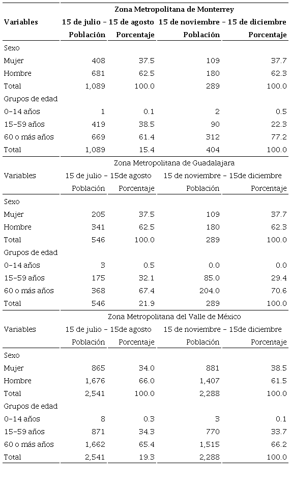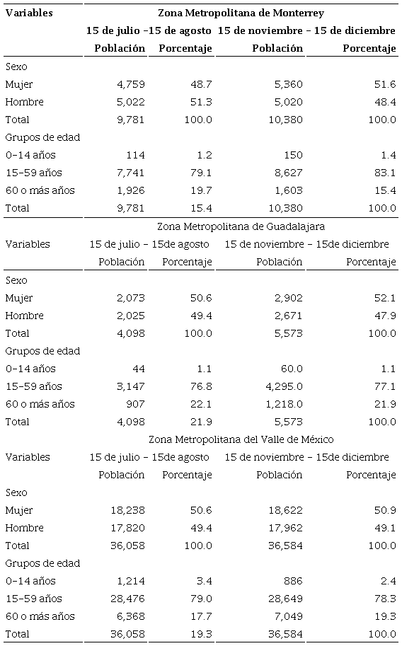 Tanto el análisis de los casos confirmados como de la mortalidad se realizó estratificando por sexo, por grupo etario y para las trez zonas metropolitanas del estudio. Se estimaron diferencias entre proporciones de acuerdo con los periodos analizados (p < 0.05). Definida la metodología de la investigación, a continuación se presenta una caracterización de las tres zonas metropolitanas en análisis.