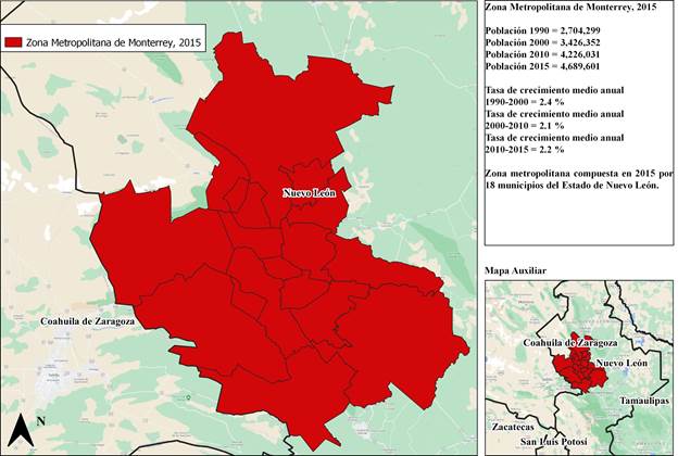 La Zona Metropolitana de Monterrey (ZMMTY) (Figura 1) se localiza al norte de México y está conformada por 18 municipios del Estado de Nuevo León. En el año 2015 esta zona metropolitana contaba con 4.6 millones de habitantes, y se caracterizaba por ser uno de los centros industriales de México. Sin embargo, en los últimos años la manufactura y el sector servicios han ido ganando terreno, por lo que actualmente esta zona es la segunda con mayor aportación al Producto Interno Bruto (PIB) nacional, lo que indica la importancia que tiene esta zona en todo el país.