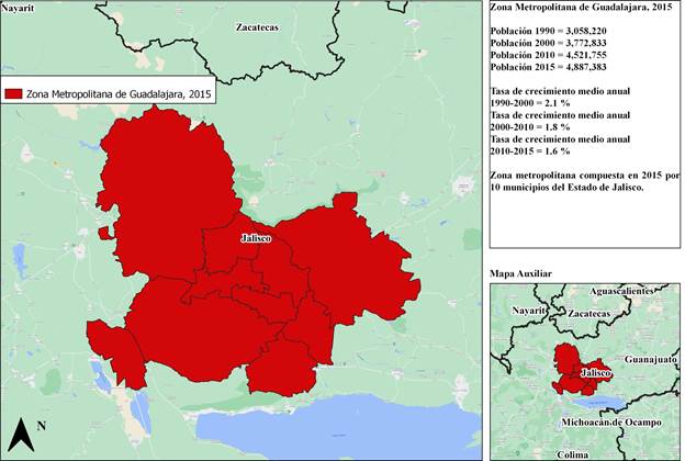 La Zona Metropolitana de Guadalajara (ZMGDL) (Figura 2) es una de las tres zonas definidas para el Estado de Jalisco, México, en conjunto con la zona metropolitana de Ocotlán y la de Puerto Vallarta, si bien ésta última comparte extensión con el Estado de Nayarit. Específicamente, la ZMGDL está compuesta por 10 municipios de Jalisco integrados por factores como la conurbación física, la integración funcional o la política urbana. Con una extensión de cerca de 3,600 km2, para el año 2015, residían 4,887,383 personas en la ZMGDL (SEDATU / CONAPO / INEGI, 2018). Sin embargo, esta zona metropolitana ha experimentado un proceso de disminución en su crecimiento poblacional ya que la tasa de crecimiento medio anual entre 1990 y 2000 fue de 2.1 por ciento, mientras que en el periodo 2000-2010 fue de 1.8 y de 1.6 por ciento entre los años 2010 y 2015 (SEDATU / CONAPO / INEGI, 2018).