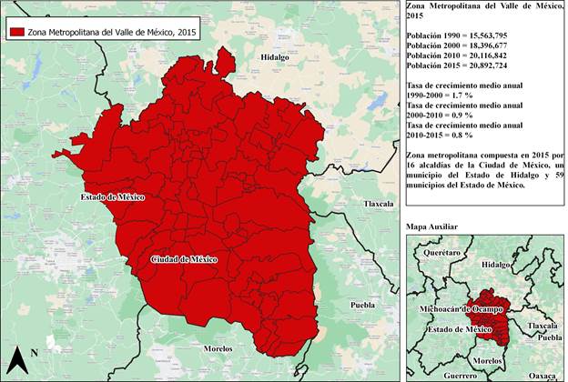La ZMVM se ha expandido a través del tiempo y hasta el año 2005 se plantea una definición oficial en la que esta zona está conformada por 16 alcaldías de la ciudad de México, 59 municipios del Estado de México y un municipio del Estado de Hidalgo (SEDATU / CONAPO / INEGI, 2018) lo que no representa un cambio para las definiciones de 2010 y de 2015. En el 2015, la ZMVM tiene aproximadamente 20.9 millones de habitantes, lo que la sitúa entre las diez ciudades más grandes del mundo y la primera de México. Respecto de su economía, la principal actividad de la ZMVM es el sector terciario, en particular, esta zona tiene una predominancia del sector comercio y los servicios al productor. Es importante señalar que la ZMVM es la mayor aportadora al PIB a nivel nacional, lo que ratifica la importancia de esta urbe en lo que respecta a los aspectos poblacionales y económicos.