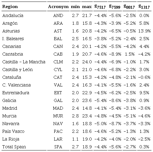 If we consider the evolution of the total Spanish IMR, we can observe that it declined from 18.9 in 1975 to 2.7 in 2017, following the general pattern of behavior of developed countries. However, differences can be seen if we split the sample. The growth rate is -5.6 per cent for 1975-1999, whilst it is -2.7 per cent for 2000-2017. The rate slightly reduces (in absolute terms) to -2.6 per cent for 2000-2012, when the Spanish government took drastic decisions which involved serious cuts in public expenditure, including the health services. After these economic decisions were implemented, we can observe that the average growth rate of 2013-2017 is no longer negative. Thus, the cuts in health expenditure seem to have negatively affected the evolution of the Spanish infant mortality rate, at least from an aggregate point of view.