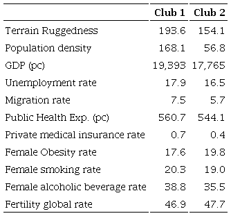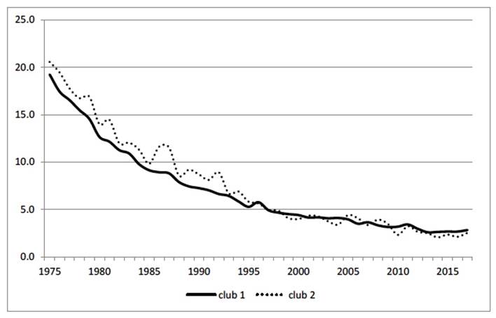 Since then, the club 1 commonly exhibits the greatest values, especially since 2010. However, the differences are significant for 2013-2017. Club 1 shows an average growth rate of 1.7 per cent, while the values of club 2 slightly vary. This result again warns us about the possible negative effect of the cuts in health expenditure on the evolution of the IMR in Spain, influencing the convergence process in the opposite direction to what would be desirable.