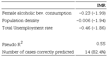 Finally, we have estimated a model in order to know which forces drive the creation of the convergence clubs. Using an ordered probit, we observe that the probability of a region being assigned to club 1, the one with the highest IMR, grows with the number of female people who admit to having drunk alcoholic beverages in the previous two weeks, the population density and the total unemployment rate. The inclusion of this last variable could again suggest that the evolution of the Spanish economy in general and the cuts in the health services in particular are strongly related with the IMR. However, this last result should be interpreted with some caution and additional research needs to be carried out, especially an analysis of causality between these two variables.