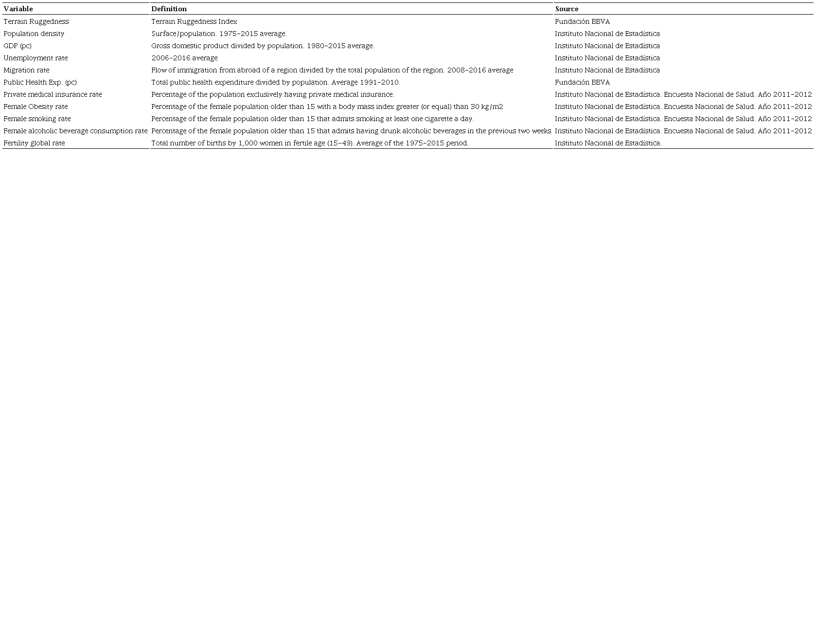 In order to reflect all these potential explanatory factors, the variables that we have selected are presented in Table 3. The socioeconomic variables selected are per capita GDP and the total unemployment rate; the health factors are the percentage of the female population that admits to smoking daily, the percentage of the female population with a body mass index greater than 30, and the percentage of the female population that recognizes having drunk alcoholic beverages in the previous two weeks; the demographic factors are the fertility rate and the population density. We have also considered the terrain roughness, the per capita public health expenditure, the private medical insurance rate and the migration rate.