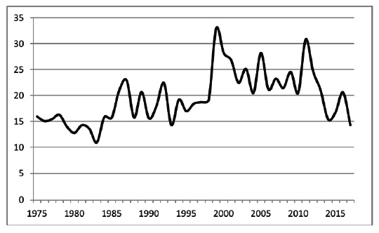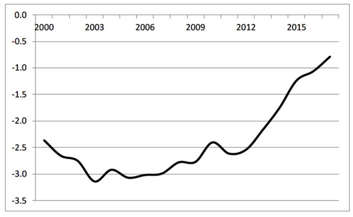Rather, they diverge and different patterns of behavior probably co-exist. Furthermore, if we compare the estimated values of the parameter β for the two samples, we can see that they are clearly different, the estimation of beta for the pre-Great Recession being approximately double the estimated value for the total sample. This would imply that the evidence against the null hypothesis was greater for 1975-2007 than for the total sample, inducing us to think that the cuts in health services since 2008, derived from the Great Recession, have affected the evolution of the IMR. In order to study this question more deeply, we have estimated the β parameter for the samples that cover the period 1975-N, with N = 2000, 2001, …, 2017. Figure 2 reflects the evolution of the estimation of the parameter β. We can observe that it was around -3.0 until 2007, whilst this value increased during 2008-2017, especially since 2012. This result implies that the evidence against the null hypothesis of convergence reduced during the Great Recession period. Therefore, the policies that aimed to reduce public expenditure, especially in the health services, affected the convergence process, diminishing the disparities in the IMR between the Spanish regions. Moreover, if we assume that the recent trend will continue, we could expect these disparities to disappear in the near future. However, the convergence direction is not clear and it is possible that the regions with the lowest IMRs become closer to those with the largest ones. If this is the case, it could be interpreted as an adverse effect of the recent health cuts. We will come back to this point later.