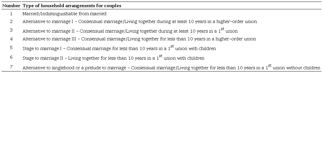Based on the discussions presented in Heuveline and Timberlake (2004) and in Surkyn and Lesthaeghe (2004), already cited in the previous section, and on idiosyncrasies of the Brazilian reality, a classification for household arrangements for couples in Brazil was proposed, as shown in Table 1.
