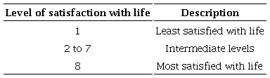 The variable for satisfaction with life had initially ten categories, as in many other databases, where 1 represents the worst possible life and 10 represents the best possible life. The first two categories, indicating the least satisfaction, were not numerous, and the first three categories were aggregated. Thus, the final variable for satisfaction with life ranged from 1 to 8, as described in Table 2.
