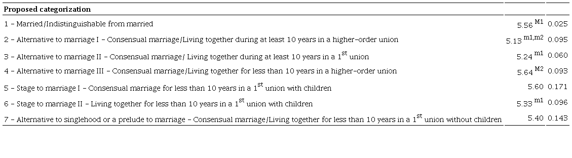 Notice that married/indistinguishable from married couples (M1) were more satisfied with life than couples whose living arrangements were described as (m1): alternative to marriage I and II or stage to marriage I. Couples whose unions were described as alternative to marriage III, stage to marriage II and alternative to singlehood or prelude to marriage showed non-significant differences when compared to married couples. A second comparison (M2/m2) showed that couples whose unions were classified as alternative to marriage III had significantly higher values for satisfaction with life than couples in the model called alternative to marriage I, and that differences between the former and the other types of arrangements were non-significant. All other possible comparisons were non-significant.