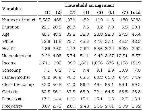 The comparison between type (7) and types (5) and 6) show some differences besides the existence or absence of children in the household, although all relationships are of short duration and individuals have similar ages. Those in type (7) were healthier, had larger incomes, were more educated, were more likely to have lived with both father and mother as adolescents, had close friendships in greater proportions, and attended religious services less frequently. These results suggest that the group whose living arrangements were described as alternative to singlehood/a prelude to marriage has a higher socioeconomic status and its members will migrate to other types of relationship, selectively choosing formal marriage to a greater extent.
