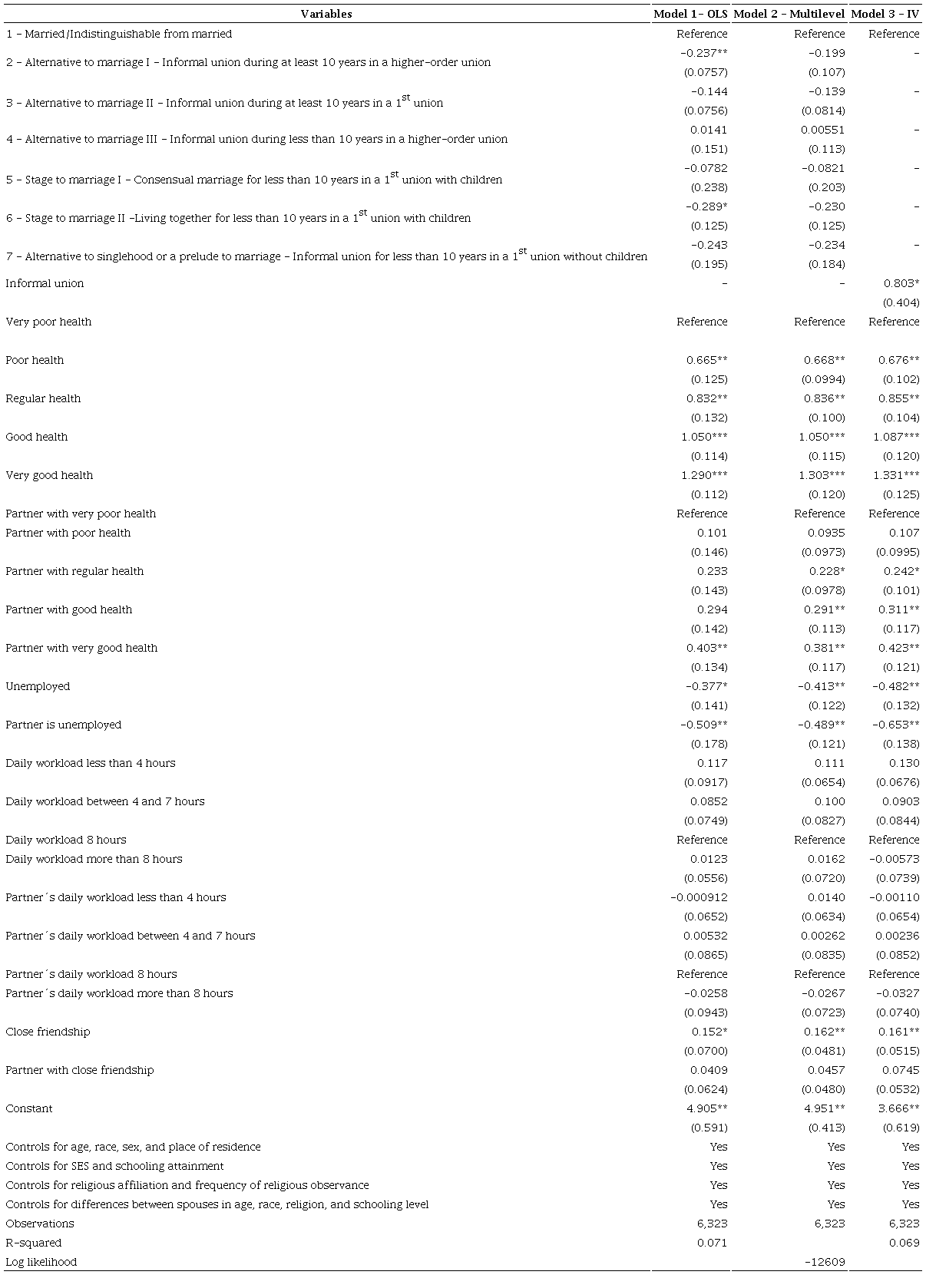 Focusing on variables for union type, only two coefficients were negative and significant in the first model, for relationships types (2) and (6). That is, in a potentially biased analysis only two types of non-marriage unions showed lower levels of well-being than married individuals. However, notice that after controlling for the dependence of the data for couples, in model 2, all coefficients were non-significant. That is, the significant results of model 1 might be caused by biased estimates. That is, model 2 show no difference in well-being levels when the different types of relationships are analyzed. Model 3 showed that when the probability of being in an informal union was addressed with instruments, the coefficient was positive and significant. The result was not at first expected and when compared with the other models, indicates that other factors that affect the propensity of belonging to a formal or informal union, as described in Table 4, might be more relevant to determine the levels of satisfaction with life.