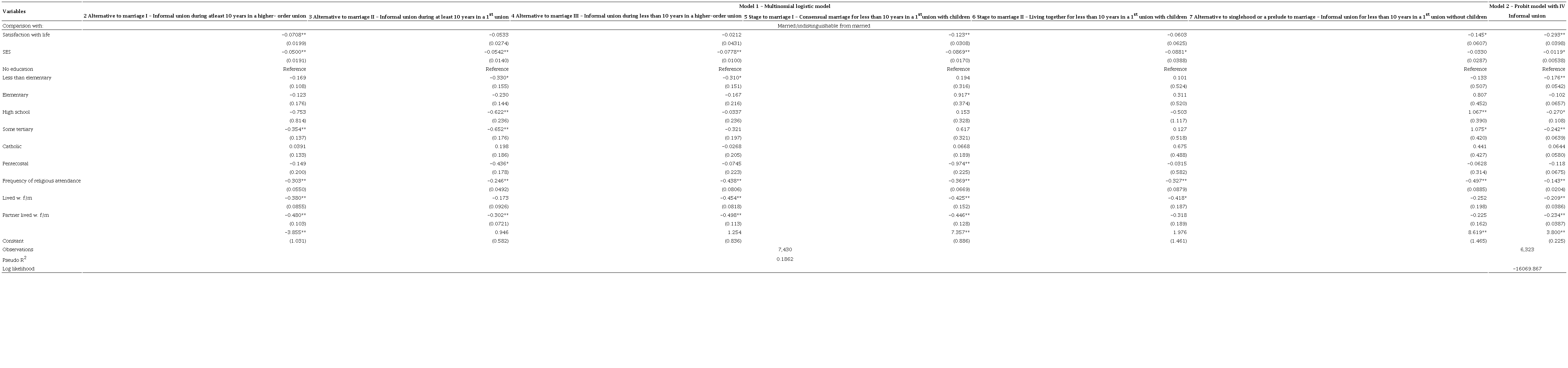 Concerning the coefficients for satisfaction with life, for the probit model, it was negative, significant and robust, indicating that more satisfied individuals showed a greater propensity to be in a relationship classified as married/indistinguishable from married, suggesting that individuals with higher levels of life satisfaction tend to marry in greater proportion. However, as shown in the multinomial model, the coefficients were all negative, but significant only for three categories. Those who were less satisfied with life were more likely to be in a relationship classified as type (2), (5) or (7), indicating that individuals in these arrangements who had higher levels of satisfaction with life had a greater propensity to marry. Those who had been in informal first unions for at least 10 years, those who had been in informal higher-order unions for less than ten years, and those who had lived together for less than ten years with children showed non-significant coefficients.