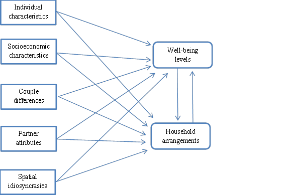 Individual and socioeconomic characteristics, differences between household head and spouse, partner attributes, and spatial idiosyncrasies, most of which are exogenous variables, influence household arrangements and life satisfaction.
