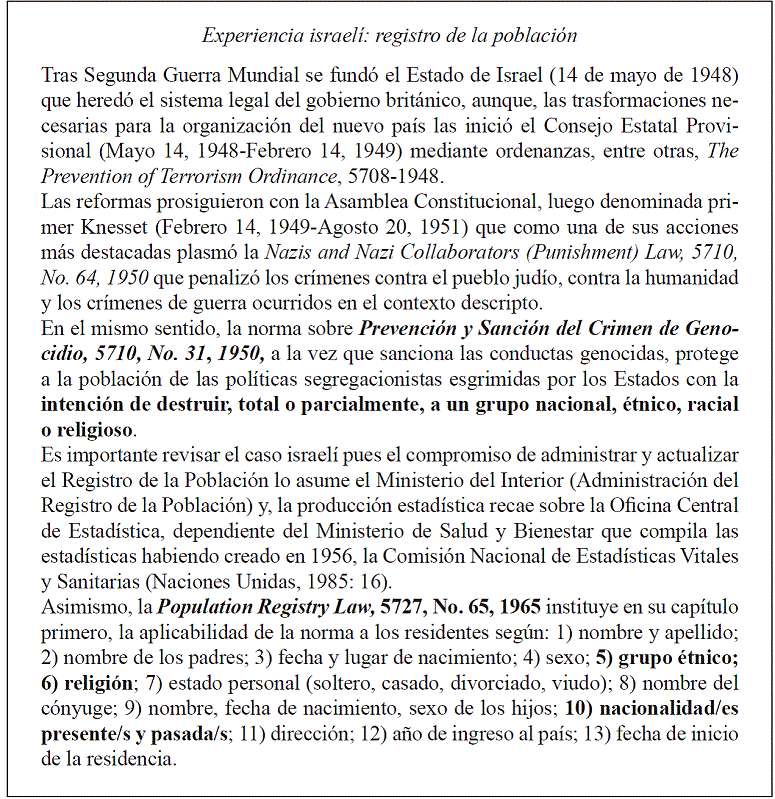 Uno de los países fundados durante el siglo XX luego de un genocidio es Israel. De modo que revisar ese aspecto del articulado legal israelí permite reconocer la necesidad de cambio de la reglamentación sobre estadísticas argentina.